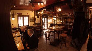 Gemütlicher und rustikal eingerichteter Thekenbereich mit weiteren Stehtischen und Barhockern für gesellige Abende „an der Theke“. Auf der anderen Seite ist ein separater Bereich mit Stammtisch, geeignet für kleinere Gruppen oder auch Sitzungen.